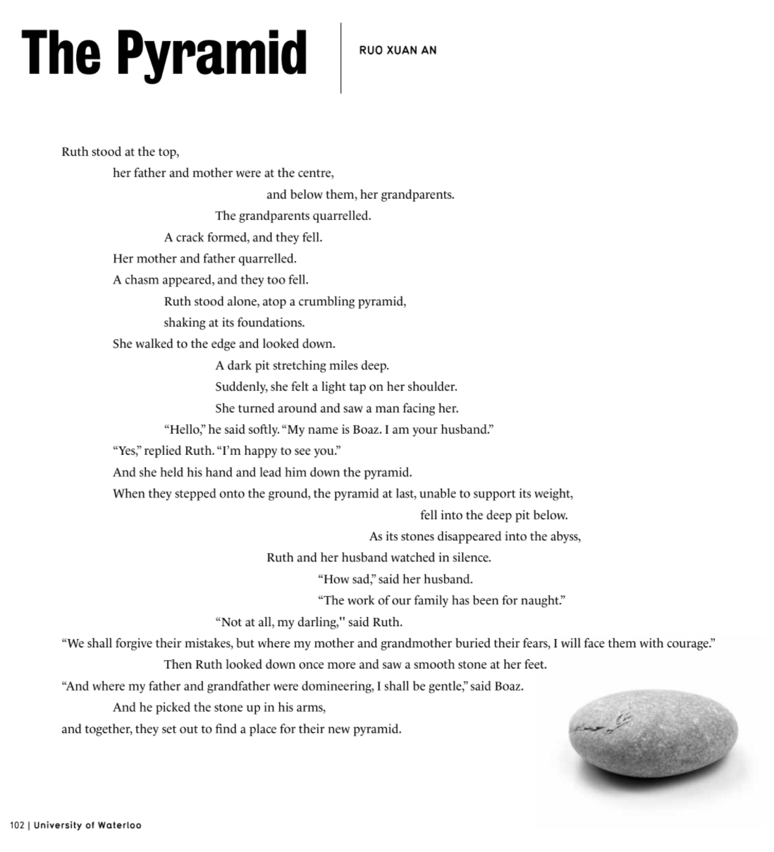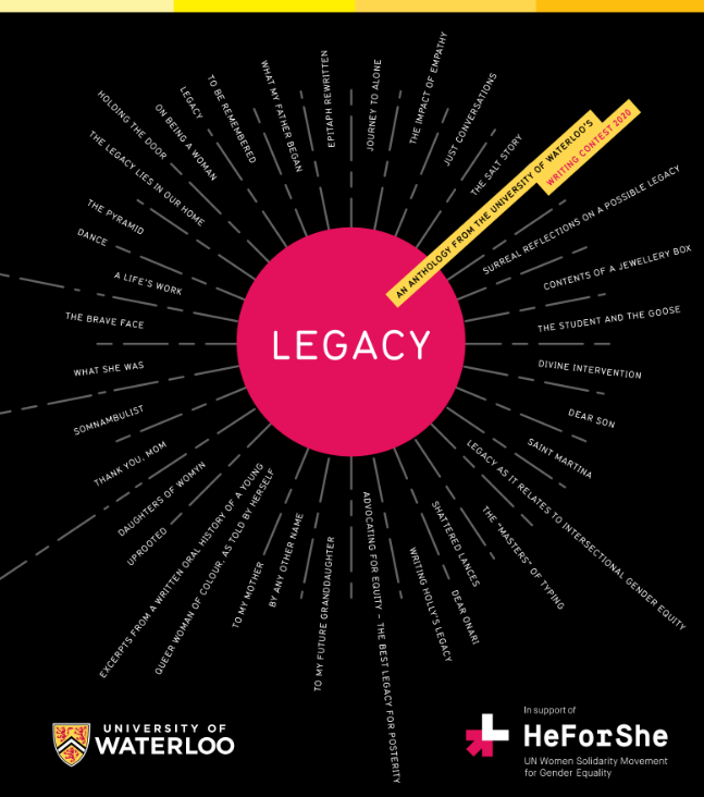 A short fiction piece that was a finalist in the 2019 HeforShe Writing Contest at UWaterloo. The piece contemplates how consequences from past conflicts within a family can be passed down from parents to their children, a theme I had encountered during my Gr.12 English class when we were studying Ibsen's A Doll's House. I remember that Friday evening in the fall of 2019 when I heard about this contest and spent that entire evening working on it. I think what helped sell my piece was the spacing between each of the lines since it gave the writing a sense of movement as the story progressed. I also added a biblical reference since they show up all the time in literature.
